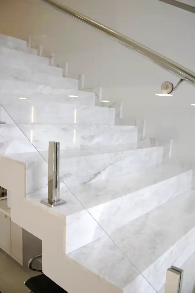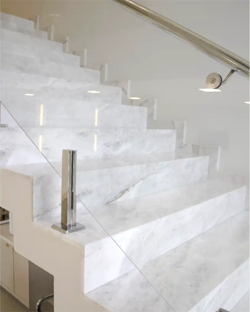 Cozinhas, banheiros e escadas com cortes de precisão e pedras de primeira linha.